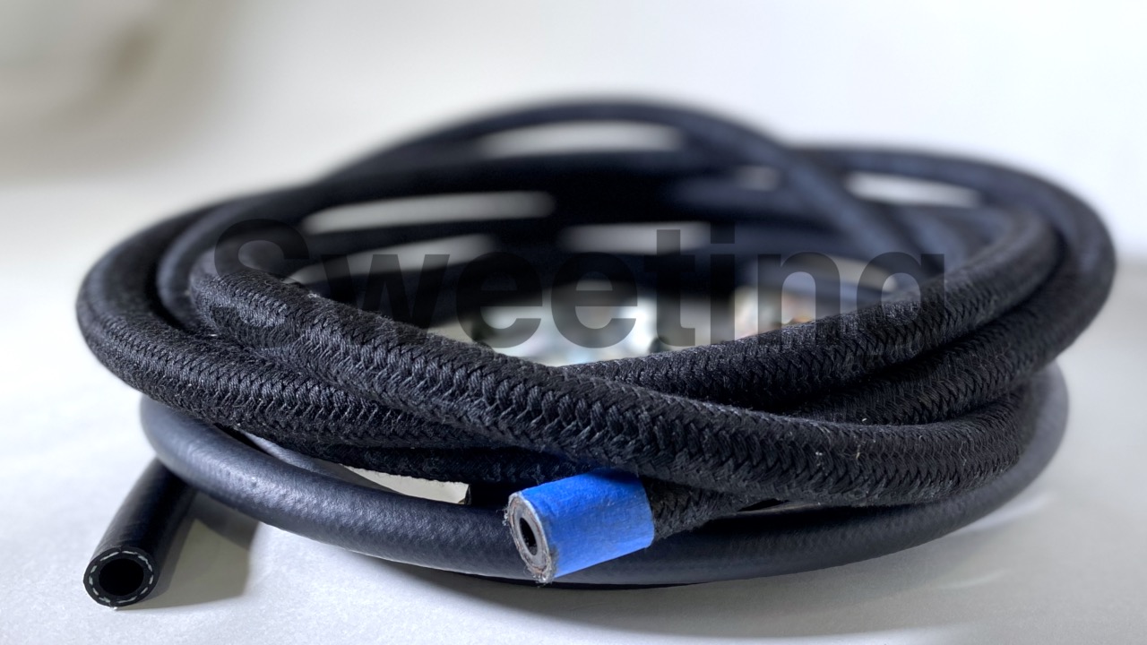 The high pressure hose has the black cloth weave on the outside, it has a stainless braid weave in the middle, uses high pressure threaded hose ends, and is rated for aircraft use. The high pressure hose goes from your power steering pump to the Hydro-Boost® and then from the Hydro-Boost® to your steering unit.