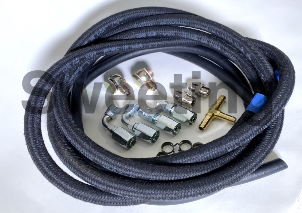 There is about 1/10 of the pressure in the low pressure side of the power steering system. You only need a light duty rubber hose and hose clamps returning from your steering gear and from your Hydro-Boost® back to the pump reservoir. You can use high pressure hose and fittings all around, but this is overkill by a factor of 10, and will be for looks - to have all the hose match.