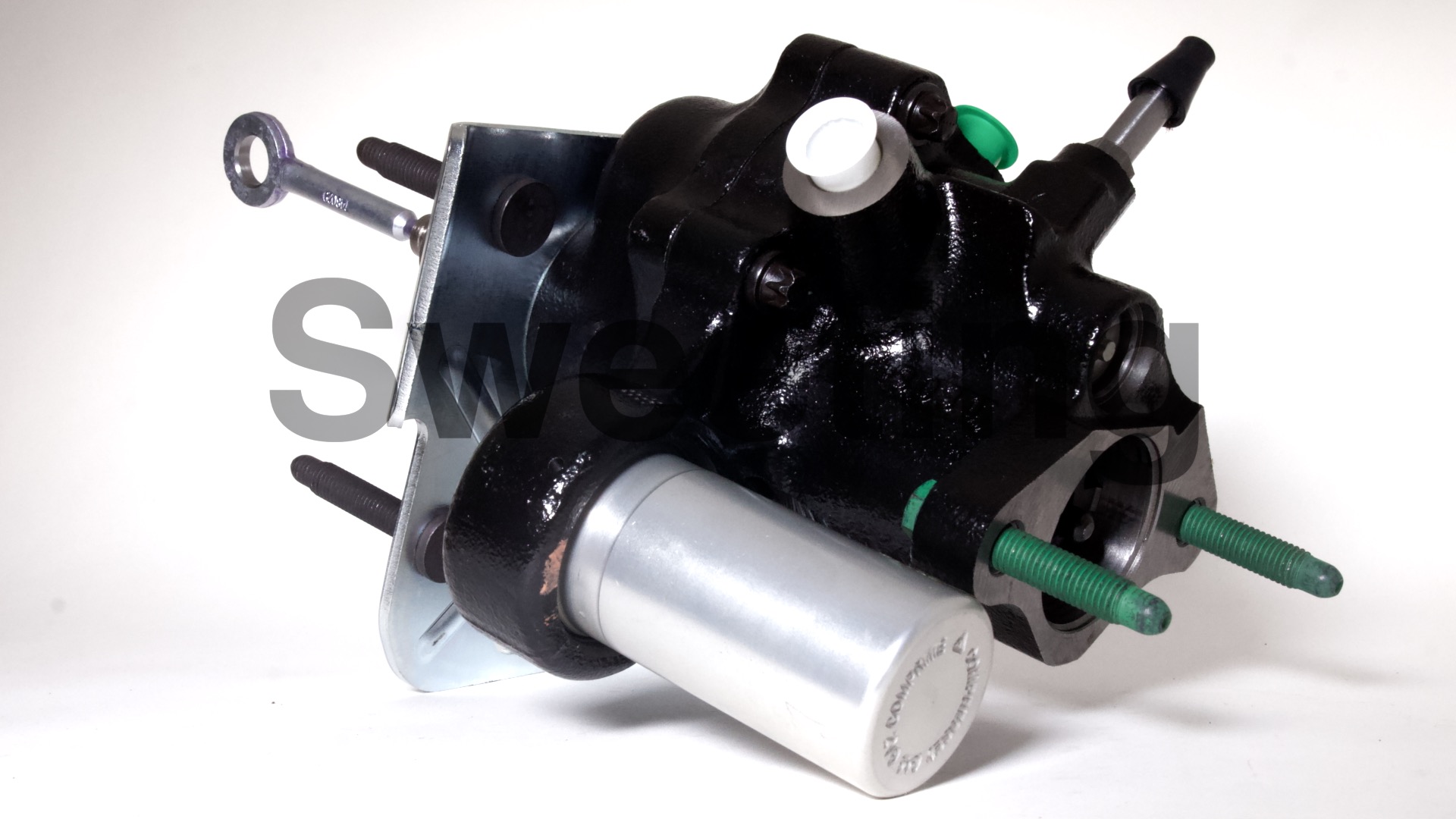 The Hydro-Boost® is smaller in diameter than vacuum boosters, being about the dimensions of an iron master cylinder, it mates to the firewall/brake pedal and the master cylinder the same way a vacuum booster does, and it fits anywhere a vacuum booster will, as well as many place a vacuum booster won't. The aluminum canister on the side is the accumulator, which stores pressure in case your engine dies to provide you with some braking and steering assist to help you come to a safe stop.
