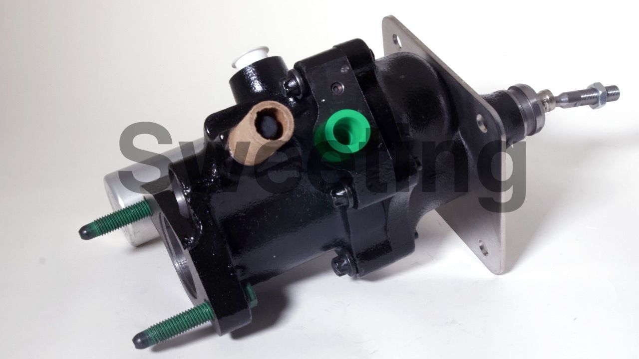 The Hydro-Boost is smaller in diameter than vacuum boosters, being about the dimensions of an iron master cylinder, it mates to the firewall/brake pedal and the master cylinder the same way a vacuum booster does, and it fits anywhere a vacuum booster will, as well as many place a vacuum booster won't. The aluminum canister on the side is the accumulator, which stores pressure in case your engine dies to provide you with some braking and steering assist to help you come to a safe stop.
