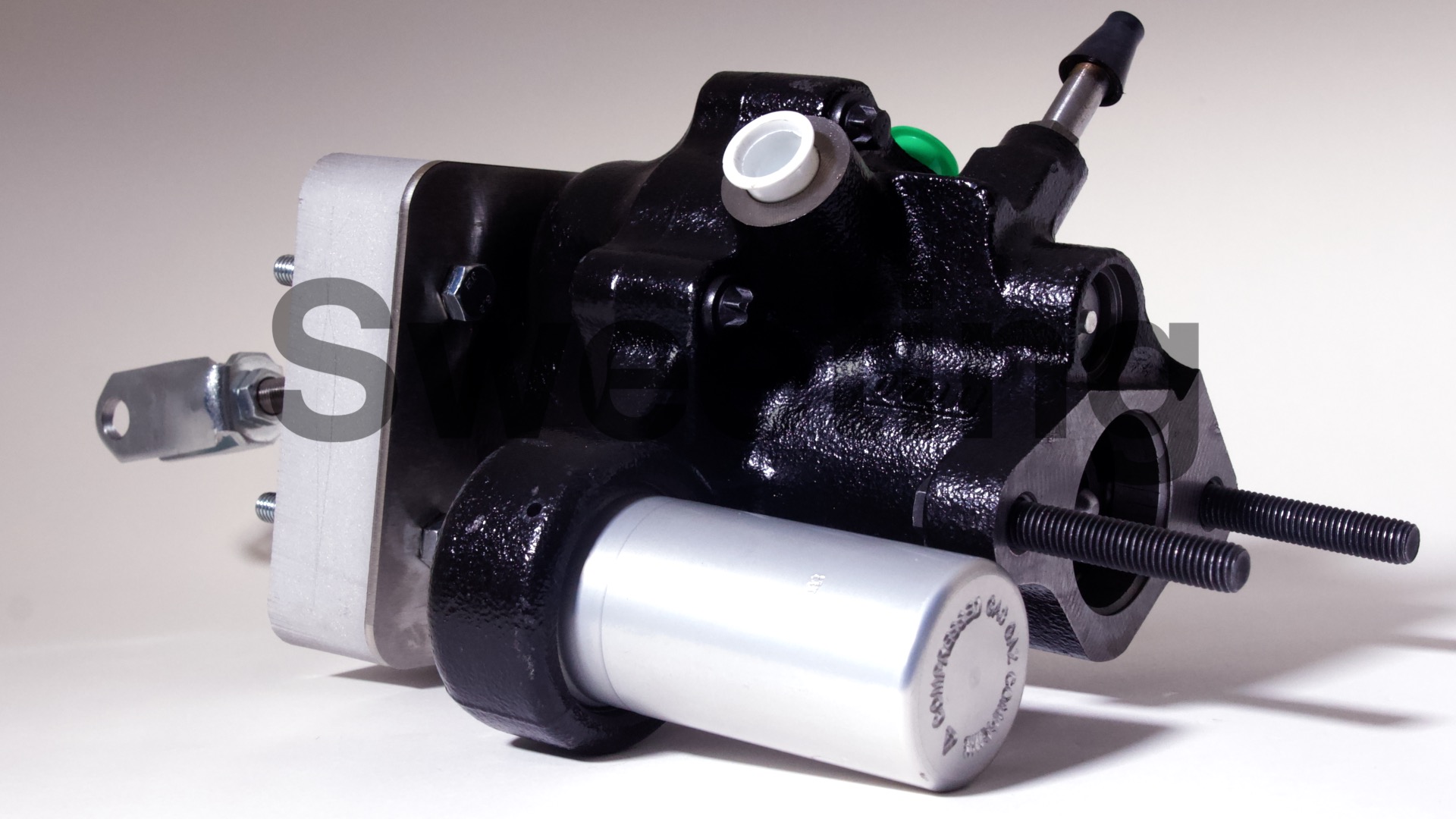 The Hydro-Boost is smaller in diameter than vacuum boosters, being about the dimensions of an iron master cylinder, it mates to the firewall/brake pedal and the master cylinder the same way a vacuum booster does, and it fits anywhere a vacuum booster will, as well as many place a vacuum booster won't. The aluminum canister on the side is the accumulator, which stores pressure in case your engine dies to provide you with some braking and steering assist to help you come to a safe stop.