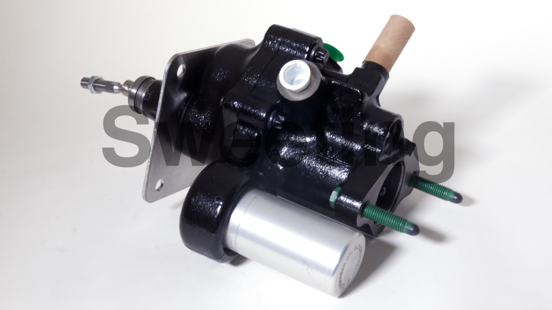 The Hydro-Boost is smaller in diameter than vacuum boosters, being about the dimensions of an iron master cylinder, it mates to the firewall/brake pedal and the master cylinder the same way a vacuum booster does, and it fits anywhere a vacuum booster will, as well as many place a vacuum booster won't. The aluminum canister on the side is the accumulator, which stores pressure in case your engine dies to provide you with some braking and steering assist to help you come to a safe stop.