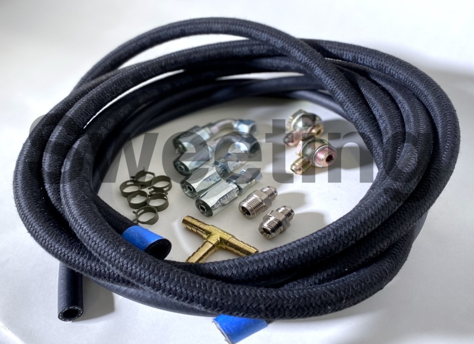 There is about 1/10 of the pressure in the low pressure side of the power steering system. You only need a light duty rubber hose and hose clamps returning from your steering gear and from your Hydro-Boost® back to the pump reservoir. You can use high pressure hose and fittings all around, but this is overkill by a factor of 10, and will be for looks - to have all the hose match.