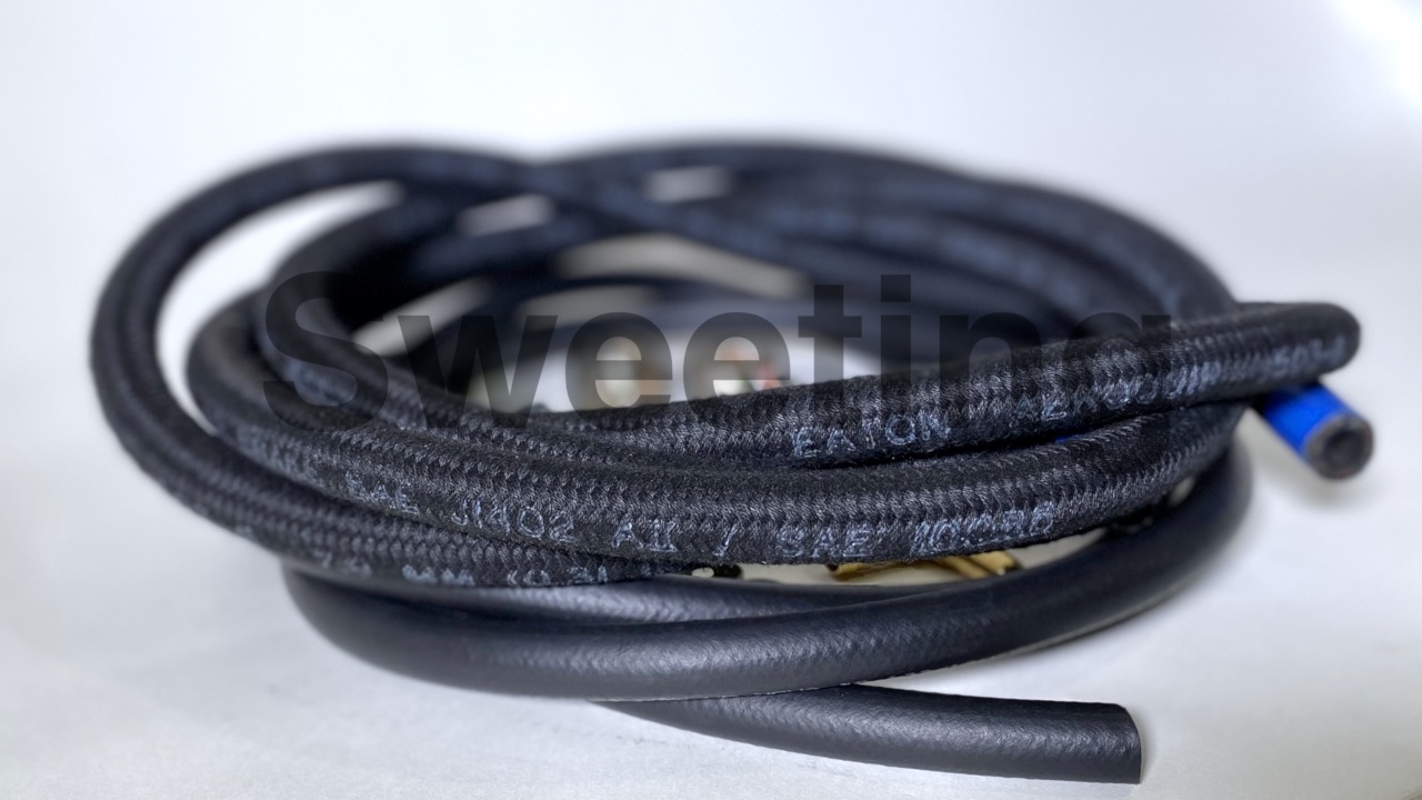 The high pressure hose has the black cloth weave on the outside, it has a stainless braid weave in the middle, uses high pressure threaded hose ends, and is rated for aircraft use. The high pressure hose goes from your power steering pump to the Hydro-Boost® and then from the Hydro-Boost® to your steering unit.