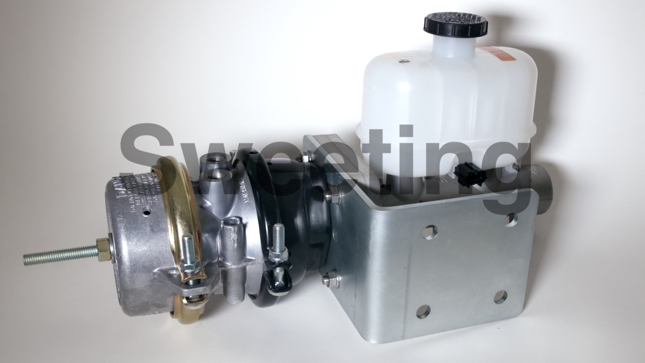 Our Air-Hydraulic brake system uses an air-valve/pedal assembly to apply a remotely mounted air brake booster. It uses air pressure from a belt driven or 12 volt onboard air system to control the air-hydraulic booster, just like the brake system on super sized big rigs and buses, but it pushes a master cylinder rather than the roller cam that mechanically spreads the brake shoes apart on full air brake systems, so it will operate your existing hydraulic brake calipers or drums. It is great for vehicles with a lot of horsepower, a lot of weight, limited firewall clearance, that don't have power steering pressure or enough vacuum to run other brake systems, and/or already have air tanks onboard for operating air-ride suspension or air powered tools.