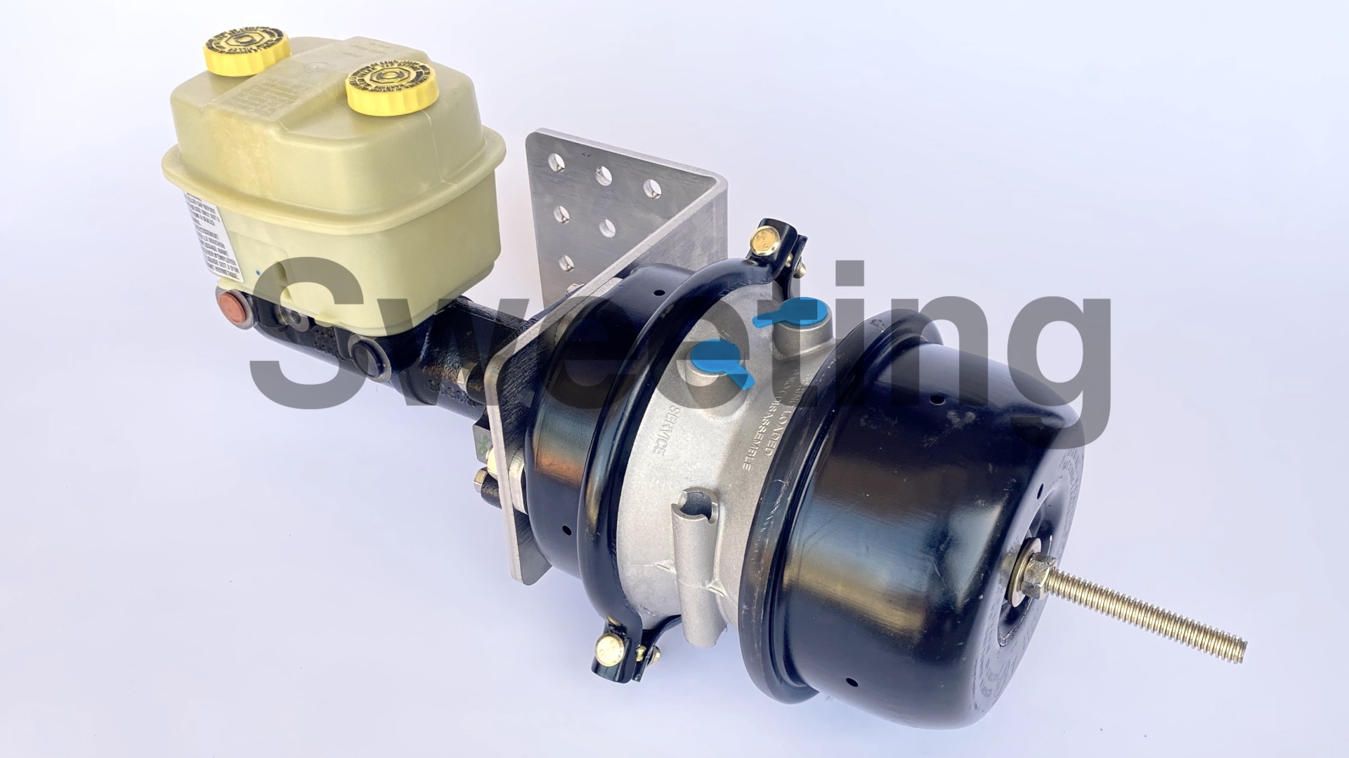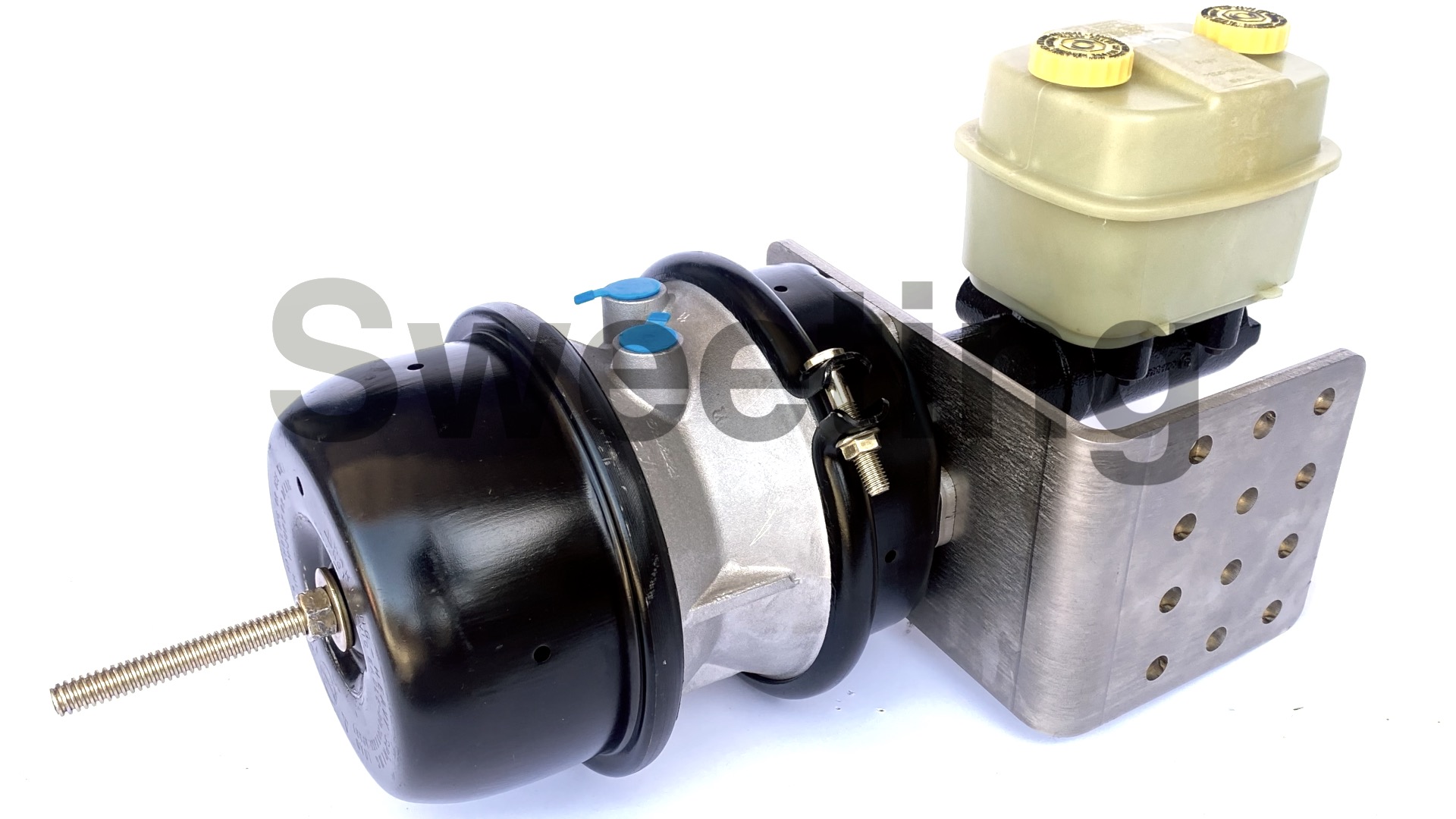 Our Air-Hydraulic brake system uses an air-valve/pedal assembly to apply a remotely mounted air brake booster. It uses air pressure from a belt driven or 12 volt onboard air system to control the Air-Hydraulic booster, just like the brake system on super sized big rigs and buses, but it pushes a master cylinder rather than the roller cam that mechanically spreads the brake shoes apart on full air brake systems, so it will operate the existing hydraulic brake calipers or drums. It is great for vehicles with a lot of horsepower, a lot of weight, limited firewall clearance, that don't have power steering pressure or enough vacuum to run other brake systems, and/or already have air tanks onboard for operating air-ride suspension or air powered tools.